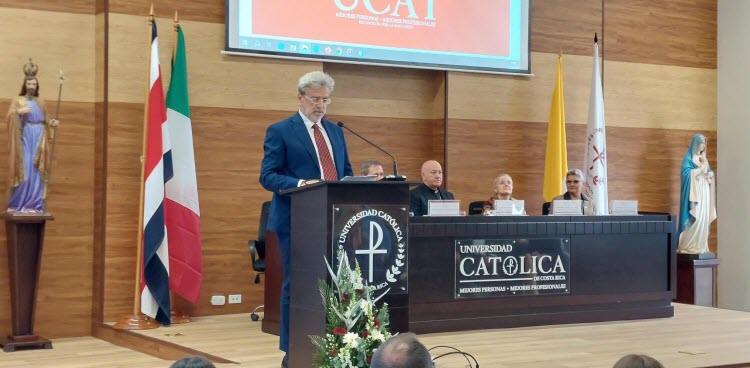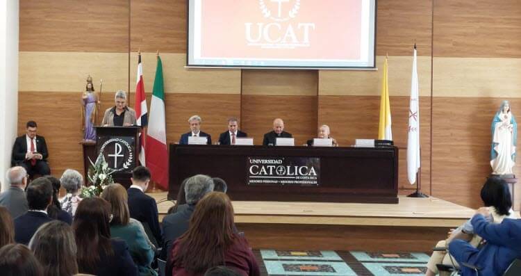 El acto solemne de entrega se llevó a cabo en el Campus Central de la UCAT, en Moravia, y contó con la presencia de destacadas autoridades, entre ellas la Embajadora Lydia Peralta Cordero, Viceministra de Relaciones Exteriores y Culto; S.E. Mons. José Rafael Quirós Quirós, Arzobispo de San José, S.E. Mons. Mario Enrique Quirós Quirós, Obispo de la Diócesis de Cartago y Gran Canciller de la UCAT y S.E. Alberto Colella, Embajador de la República de Italia en Costa Rica.